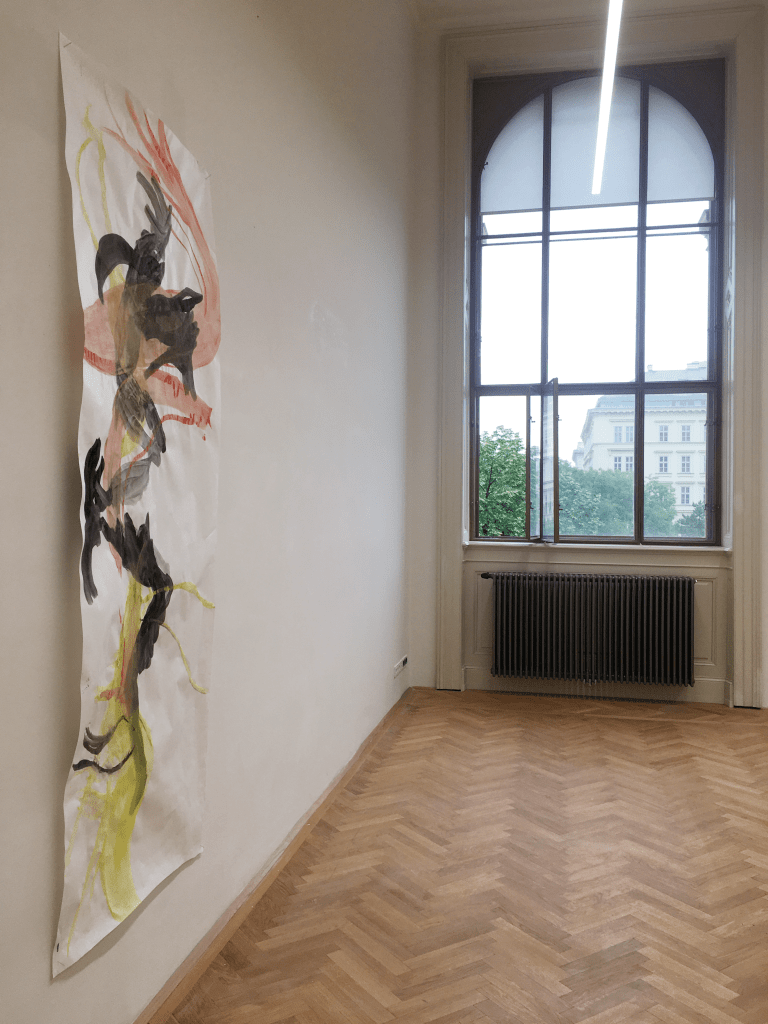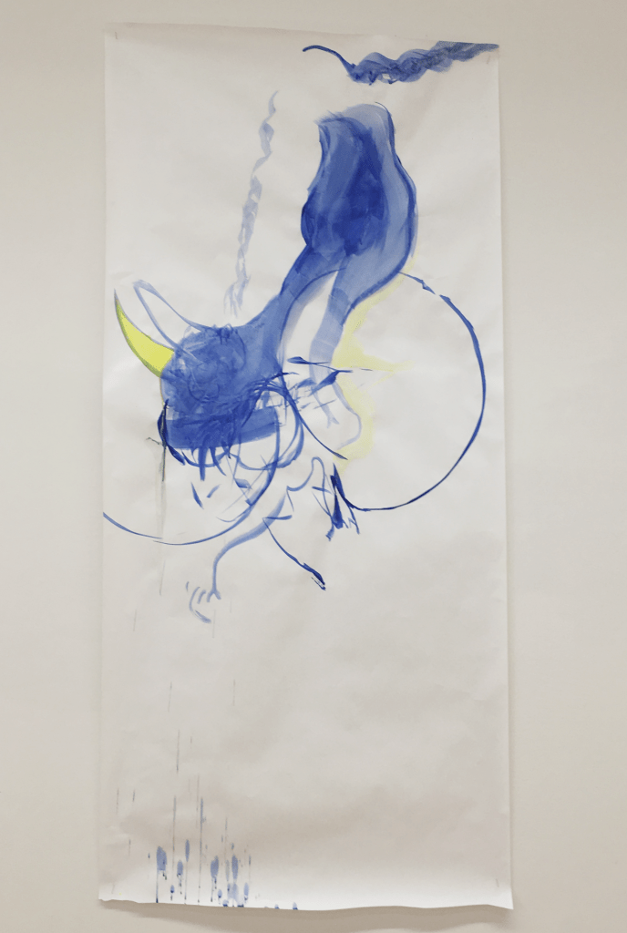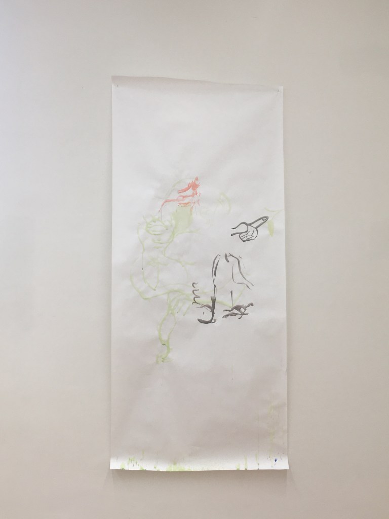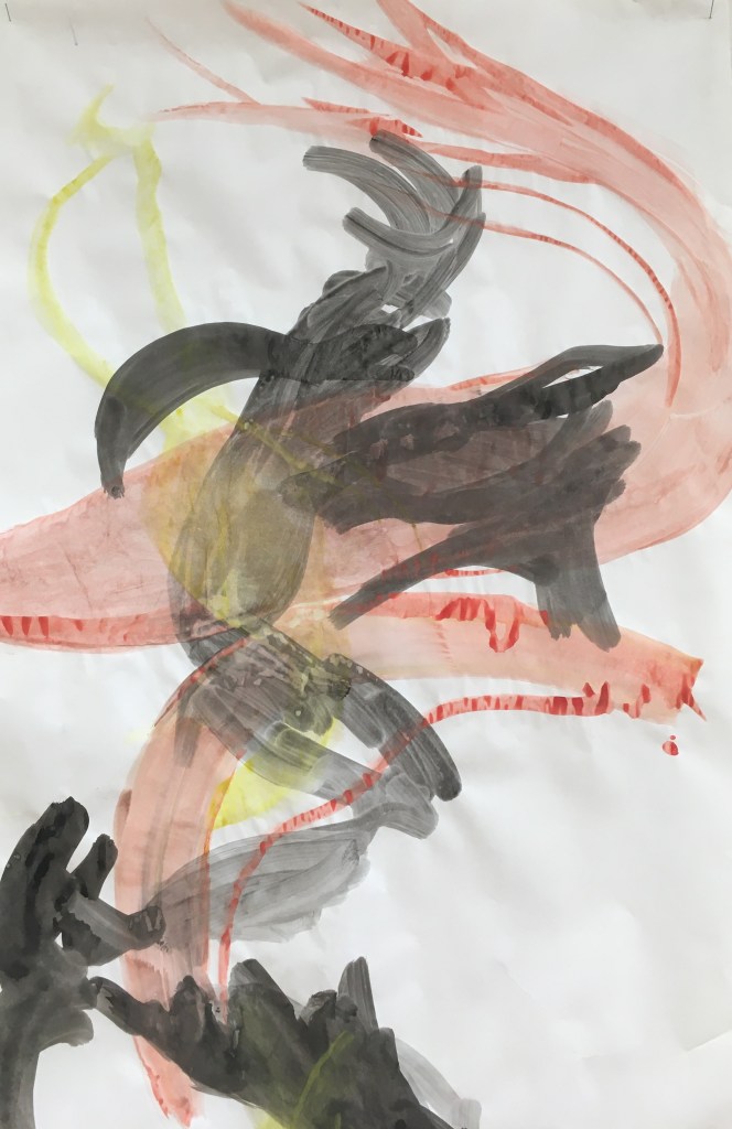 Ein Junge, gestern Abend in der Ubahn. Den Oberkörper weit nach vorne gebeugt, die Hände nach hinten gestreckt. Wie ein Flugsaurier rennt er lustvoll fauchend an den herumstehenden Leuten vorbei. Er beugt die Knie, er wartet, im letzten Moment bevor sich die Türen schließen, macht er einen großen Satz in die Bahn und fährt davon. Ich öffne die Augen und sehe zusammenhangslose Striche und eine angedeutete Hand. Ich verlängere die Linie der Hand bis zum Arm, folge dem Pinsel mit meinen Augen, dann meinem Kopf und spüre, wie sich mein Nacken verkrampft. Kleine, rote Nadelstiche ziehen in meine Schultern und übers Papier.